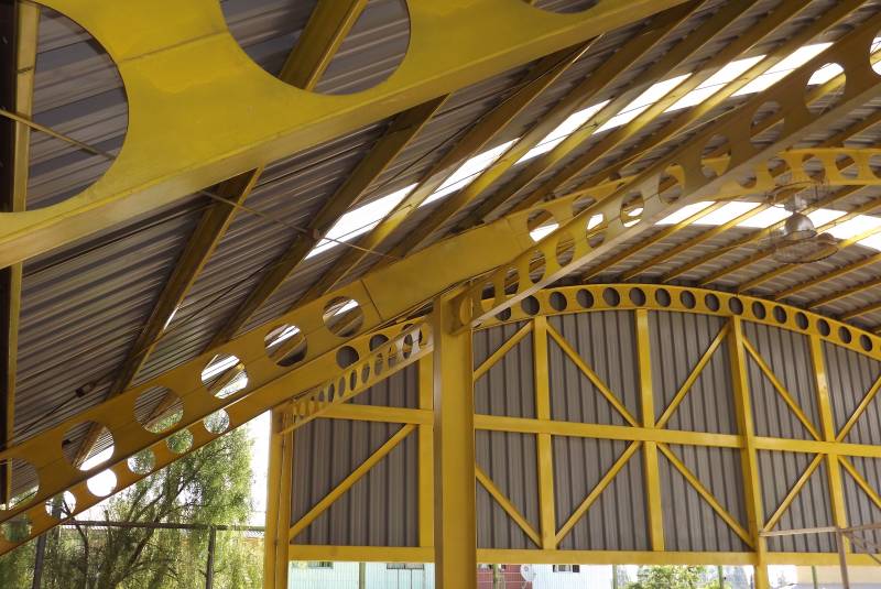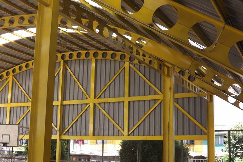 Cubierta de Multicancha en base a Perfilería metálica con Pilares con Perfiles IN y Vigas Celulares curvas.